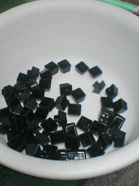 中性洗剤にいれて洗って乾かして~ パズルの様にキーをはめていました。 わかる人は画像見ただけで判ると思うけど 3年近く愛用してきたキーボードが 「いい加減掃除しようよ!」って位汚かったので 生まれて初めて洗いました。 とてつもない量の埃がドバドバ出ました。 キーを外すには裏側のネジを全部止めてカバーを外してからと 思っていたんだけど 実際はマイナスドライバーをねじ込んだだけで外れた。 あっけなくて驚いた。 ただ、キーの配列がわからないところが出てきて、悩んだw メモっとけばよかったのねw 以外と悩んだのが↑のキー。 微妙な角度でカーブがついてるのでハメたり、外したり・・。 そしてお約束。 「Q」のキーをどこかにふっ飛ばしてた。 すぐに見つかったけど。 次に洗う事はあるんだろうか・・? 画像は洗う前のキーボードの状態。 フラッシュ焚いたらスゲー汚く写ってるし~www と、洗ってる最中。 忍者ブログ [PR]